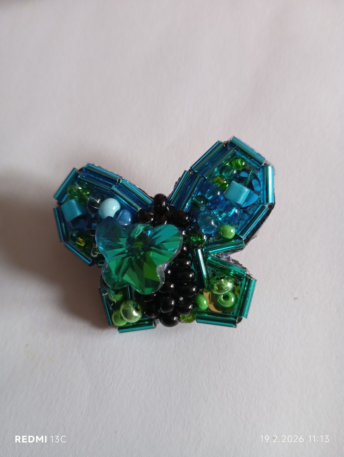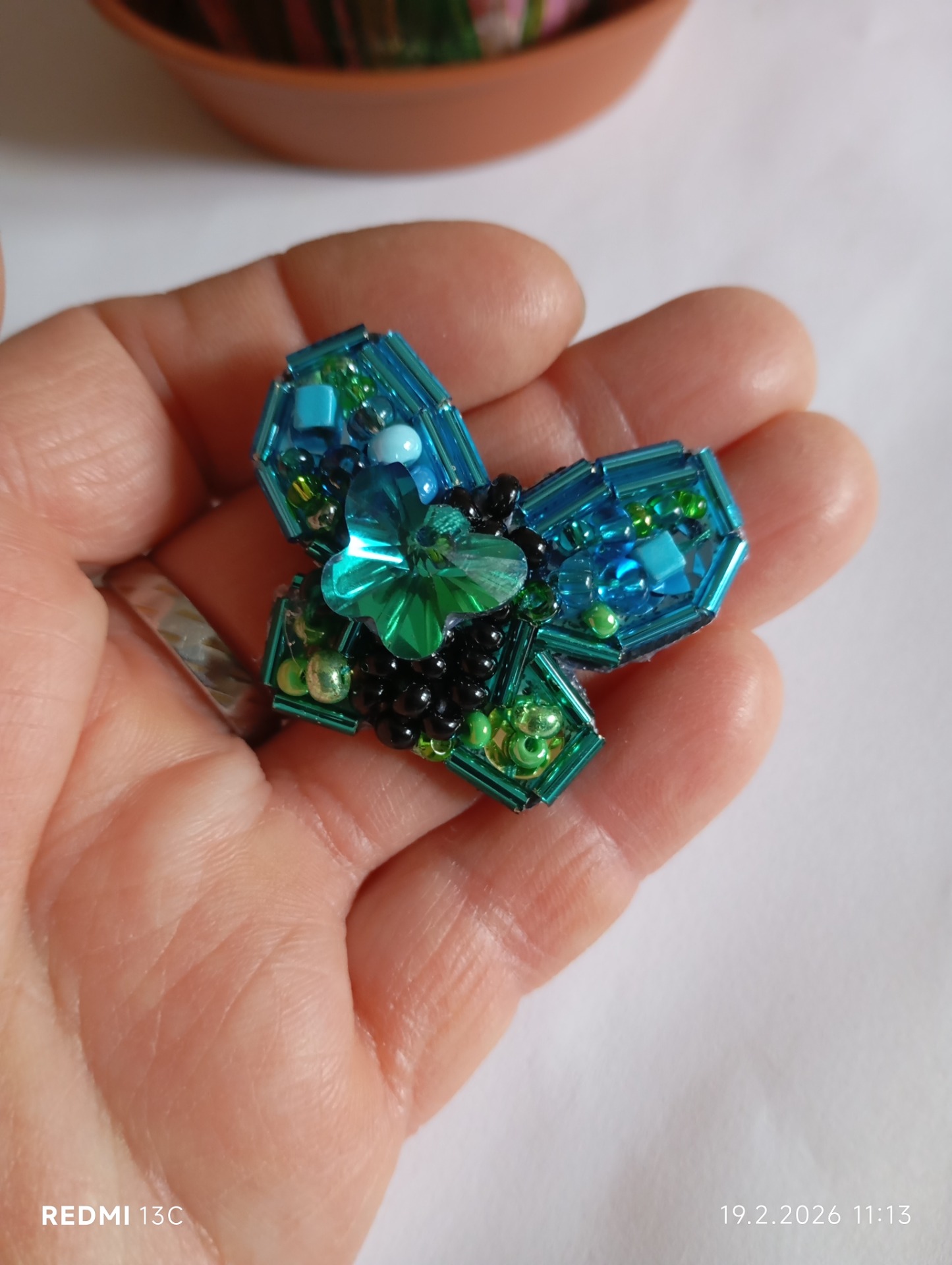Ručně vyšívaná brož, skleněné korálky, na zapínání