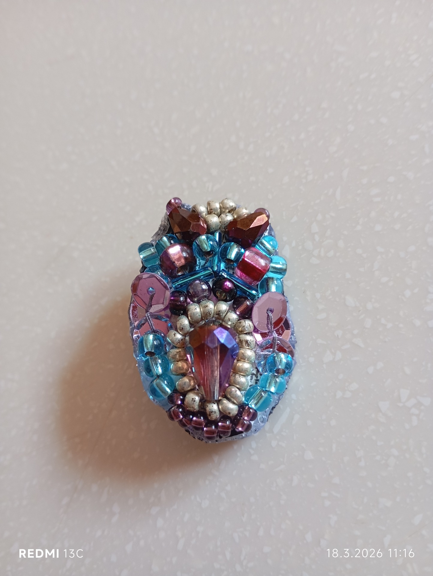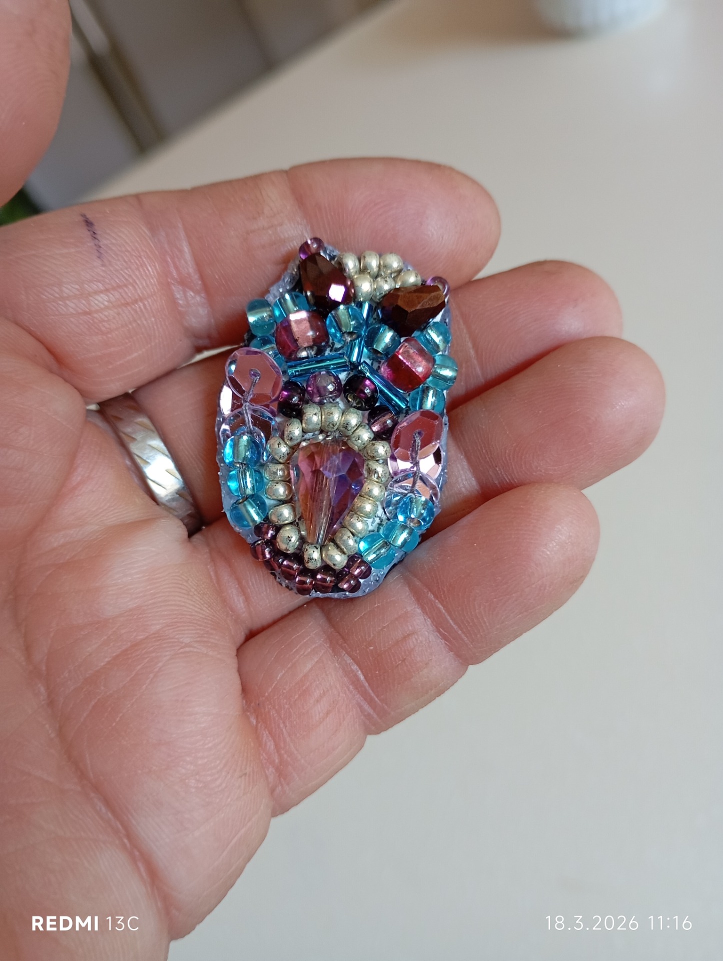 Ručně vyšívaná brož, skleněné korálky, na zapínání